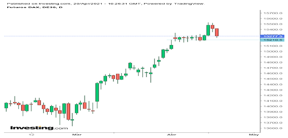 ibex 35 Análisis Técnico del Dax El Dax Alemán mantiene su fortaleza alcista, alcanzado máximos históricos el pasado 16 abril en la cuota de 15550. En estas dos últimas sesiones está realizando una consolidación de las últimas subidas, el primer soporte lo tiene en los niveles de 15200 y si los rompe a la baja el siguiente soporte lo tiene en la cuota de 14800. Estos soportes puede representar una buena opción de entrada al alza- buy en compra con objetivos de los máximos anteriores de 15500.