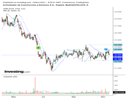 Gamesa ACS, ha publicado resultados y en los primeros nueve meses del año el beneficio neto atribuible del Grupo ACS llegaba a los 545 millones € con un incremento del 24,7 % respecto al año anterior, “ tenemos que ser conscientes a la hora de comparar datos, que el año 2020 es una año atípico por el impacto de pandemia”. La cifra neta de Negocios se ha reducido un -2,8 % y el Ebitda ha mejorado un + 12,5 %. Técnicamente la cotización se encuentra en 23.03 € en mitad del proceso de lateralización que le lleva por la parte de arriba a la cuota de 23.66€ con extensión a 24,32 € € y por abajo a los 22.12 €. Técnicamente, si se está dentro del valor mi visión es mantener, si se está fuera del valor es esperar a que retroceda a niveles de 22.12/22.5 € o que rompa al alza los niveles de 23.66/24.32 €.