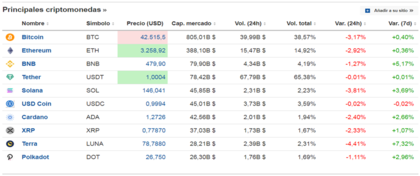 10 primeras criptomonedas por capitalización fuente:Investinog.com