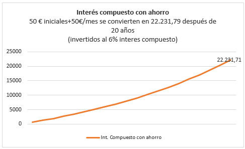 Aprovecha la magia del interés compuesto. Imagina que comienzas a invertir cuando tu hijo nace o es aún pequeño. Comienzas con 50 € y destinas 50 € al mes, incluso puedes aumentar la aportación en cumpleaños, bautizo, comuniones… ¿Cuánto obtendríamos al cabo de 20 años?