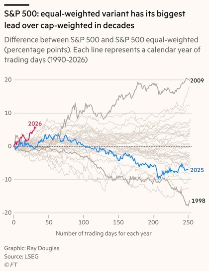 En 2026 el S&P 500 equiponderado —la versión del índice que trata a todas las empresas por igual, sin importar su tamaño— está superando al índice tradicional (por capitalización bursátil) por el mayor margen en décadas.