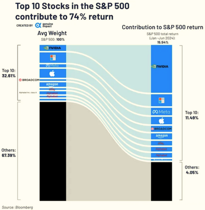 Cuando miramos el S&P 500, tendemos a ver un número. Un único dato que sube o baja y que interpretamos como el pulso de la economía americana. Pero ese número esconde una realidad mucho más compleja: en él conviven 500 empresas con pesos radicalmente distintos, y unas pocas —las más grandes— determinan casi por completo su dirección.