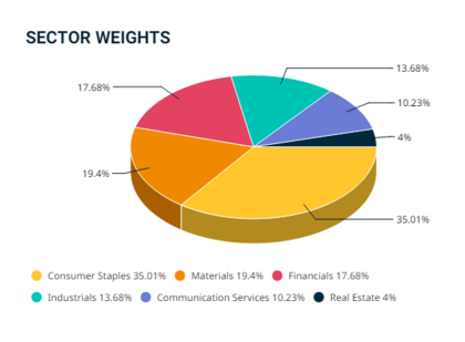 Viendo el desglose sectorial, invierte principalmente en servicios financieros (24,47%), materiales básicos (24,31%) y consumo defensivo (20,28%) y sobre-pondera especialmente los servicios financieros.