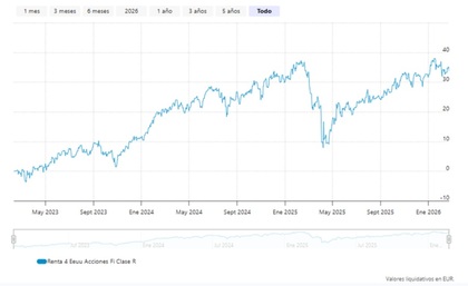 Renta 4 EE.UU. Acciones FI se revaloriza un +4,1% en dólares y un +3% en euros en el mes de enero de 2026. Desde su creación en febrero de 2023, se revaloriza un +56% en dólares (+15,99% anualizado) y un +42% en euros (+12,40% anualizado).