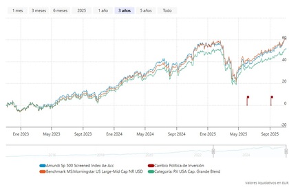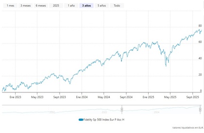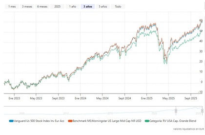 En los últimos tres años ha obtenido una rentabilidad anualizada del 16,08%, con una volatilidad del 13,42% y una máxima caída del -15,73%, cifras que reflejan una gestión pasiva muy eficiente y un perfil de riesgo acorde con el mercado estadounidense. Su ratio Sharpe de 0,88 muestra una relación adecuada entre riesgo y rentabilidad, aunque algo inferior a la de fondos con cobertura o con criterios ESG más ajustados.