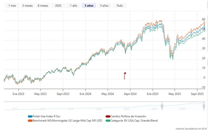 El Pictet-USA Index R EUR es un fondo indexado que replica el comportamiento del mercado estadounidense a través del S&P 500, gestionado por la prestigiosa casa suiza Pictet Asset Management. Está denominado en euros, sin cobertura de divisa, por lo que la evolución del dólar también influye en sus rendimientos.