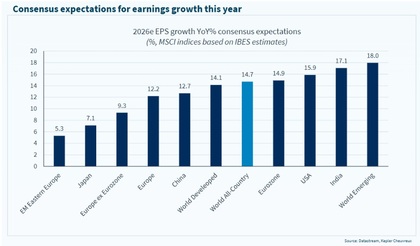 • En renta variable, tras un 2025 de notable resistencia en las bolsas europeas, consideran que la reanudación del crecimiento de los beneficios empresariales es clave para mantener la buena evolución. Aunque no esperan que se cumplan las optimistas previsiones de consenso (que apuntan a un crecimiento anual del 13,4% para las empresas europeas hasta 2027), sí ven una tendencia positiva.