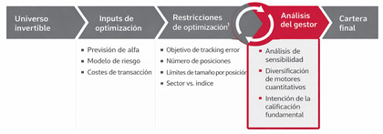 Proceso de construcción de cartera que parte del universo invertible, aplica inputs y restricciones de optimización, y culmina con el análisis del gestor para definir la cartera final.