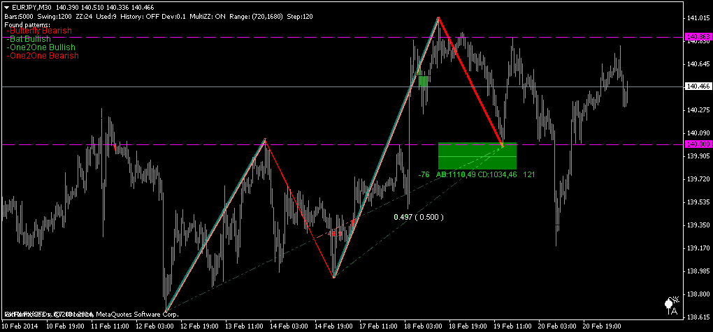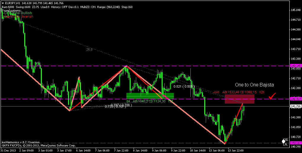 Interesante formación de un One to One Bajista en el cruce Eurjpy, para el time frame de 1 hora. La PRZ coíncide con un nivel de soporte previamente perforado, devenido en resistencia con un primer rechazo del precio. Dar seguimiento, esperar la reacción de la acción del precio y un patrón de velas que confirme la reversa.