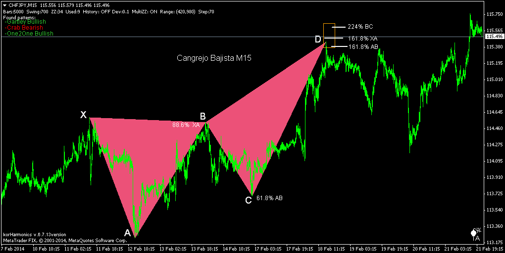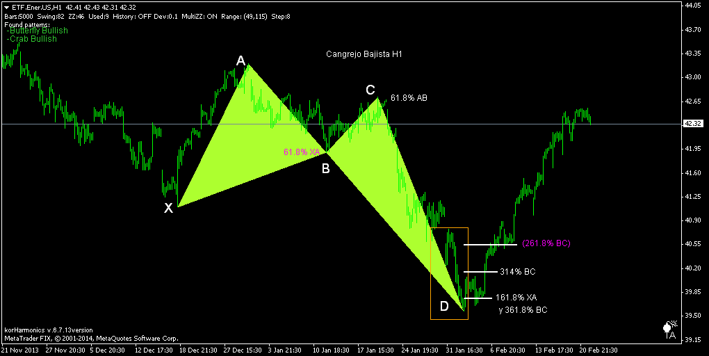 El patrón Cangrejo cuando se da es muy efectivo, y se caracteriza por las proyecciones extremas respecto a las ondas BC y XA (analizadas en nuestra Guía de Patrones Armónicos). El punto más crítico de éste patrón se alcanza en el nivel 161.8% de la onda XA.