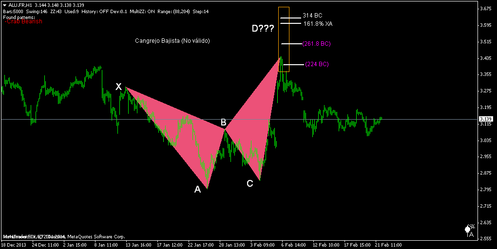 La fig. 3 nos muestra un patrón Cangrejo no válido. El precio no alcanza el nivel crítico que lo hace completo y válido, 161.8% de XA.