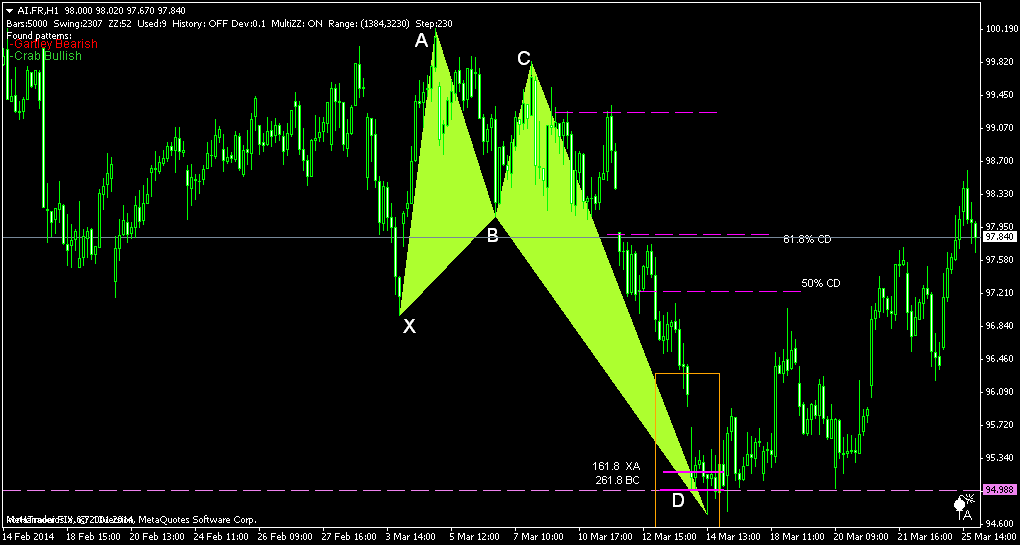 En la siguiente imágen podemos apreciar como se formó un soporte armónico donde convergen los niveles 261.8% BC y 161.8% de XA, el precio prueba los niveles y nos brinda una formación de cambio en la dirección del precio, permitiendo la entrada a mercado y tomando beneficios cerca del 50% de la onda CD.