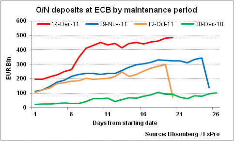Pero empieza a evidenciarse, de manera cada vez más clara, que las herramientas de la política del BCE comienzan a ser más inefectivas a medida que la eurozona se encuentra más inmersa en el credit crunch, debido a una confluencia de factores. El nuevo impulso apoyado en las provisiones de liquidez ( vía 3 años el mes pasado) ha resultado en un retorno de los fondos vía los depósitos overnight del BCE (ver gráfico), que actualmente representa un 1% del PIB de la eurozona.