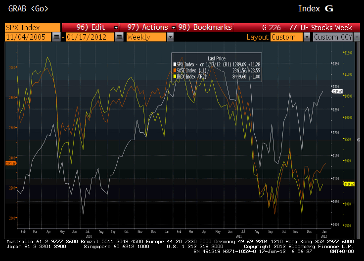 Observar cómo el rendimiento del Ibex está siendo bastante pobre , pudiendo deberse a los problemas estructurales de los que adolece. Mientras el resto de selectivos parece que han tomado dirección nuestro selectivo se queda atrás.