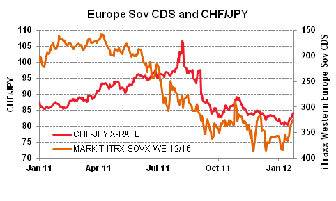Es interesante destacar la alta correlación inversa de CHF / JPY debido al sentimiento de riesgo en Europa durante los últimos tres meses con el CHF / JPY ganando terreno así como el índice de los CDS soberanos de los gobiernos europeos mejorando (véase el gráfico). Esto sugiere que el yen se está convirtiendo el sentimiento soberano en Europa y que según vemos sigue estando limitada por el techo del CHF. Si esto continúa, entonces el destino del yen está más con Europa que con Asia para los próximos meses.