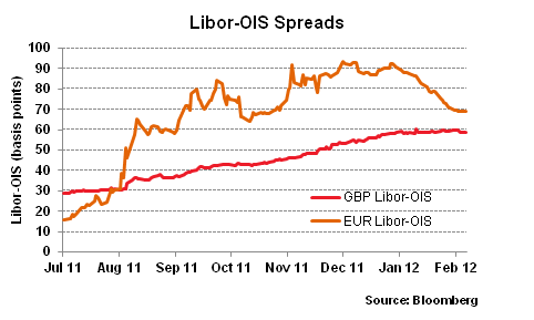 Como muestra el gráfico, el spread para euros se ha movido por encima del de la libra para mediados del año pasado, a medida que la crisis en la eurozona se agrava aún más. Efectivamente el gap entre los dos era de 40pb al final del año pasado. Ahora es de únicamente 10 pb. Por supuesto la inyección de dinero a 3 años del BCE ha jugado un papel clave en la bajada del spread para euros del Libor-OIS, pero a ello hay que añadir que el equivalente de la libra no ha caída durante dicho período.
