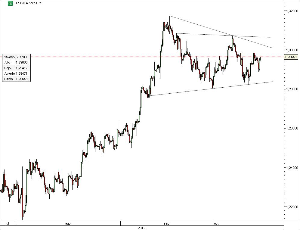 El cruce de nuestra divisa contra el dólar americano que venimos analizando en las últimas jornadas nos empieza a dar más pistas de lo que podría desarrollar más adelante. Hace unos días estábamos pendientes del mínimo del mes que finalmente fue respetado y por ahora continuamos marcándolo como referencia. Si analizamos el desarrollo de esta divisa durante los últimos tres meses está clara que continúa consolidando la parte alta del impulso que comenzó en agosto. Posteriormente formó un mínimo en 1.28 que tomamos como referencia para luego rebotar hasta los 1.3070 para después empezar a dudar sobre su dirección ya que el precio se aproximó al mínimo cayendo por debajo de su directriz y amenazando con ir a formar un mínimo más abajo. Ahora se encuentra entre esas dos zonas y mientras no se decida por la parte alta, deberíamos ser cautos si estamos fuera del par. Superar la parte alta del triángulo tampoco daría la señal para volver a posicionarse ya que se podría quedar por debajo del máximo previo y podría desarrollar un canal horizontal. Así que si se dan cierres diarios por encima de los 1.31 nos haría pensar en futuras escaladas pero mientras continúe consolidando es preferible observarlo de cerca para no arriesgar más de lo debido.