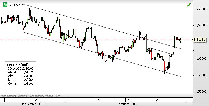 La cotización del cruce tras rebotar en la parte baja del canal lateral bajista y situarse encima de los 1.60 libras por dólar, se disparó con fuerza hasta casi superar los máximos semanales. Ahora se encuentra en la misma zona y no ha corregido prácticamente nada. Así que veremos si continúa el impulso y deja atrás el canal lateral-bajista. Superando los máximos de la semanales se rompería la tónica lateral.