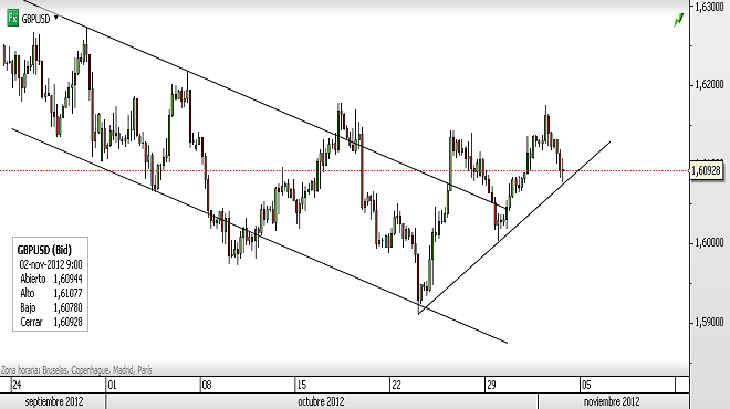 Ayer pudimos conocer el PMI manufacturero del Reino Unido que finalmente se situó seis décimas por debajo de lo previsto y el anterior. Este indicador continúa mostrando una contracción de la economía Británica. Tras el dato el cruce fue a marcar un nuevo máximo por encima de los niveles de la semana pasada pero posteriormente se fue desinflando cayendo por debajo de los 1.61. Todavía se encuentra por encima del canal lateral que viene desarrollando a lo largo de todo el mes de octubre pero buscando zonas de soporte tras realizar dos impulsos al alza.