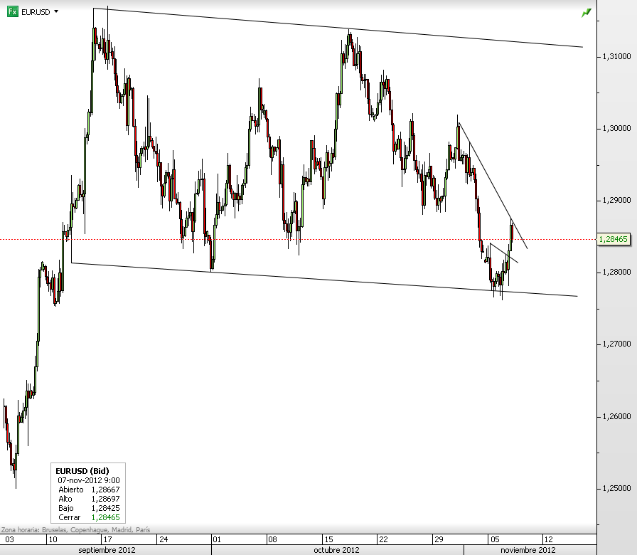En el anterior comentario reflejábamos que el cruce había perdido el mínimo del mes de octubre pero se había venido a parar en una paralela de la resistencia que habíamos trasladado desde los máximos a los mínimos. Tras consolidar un día entero la zona ha rebotado por encima de los 1.28 dólares animado para la reelección del presidente americano.