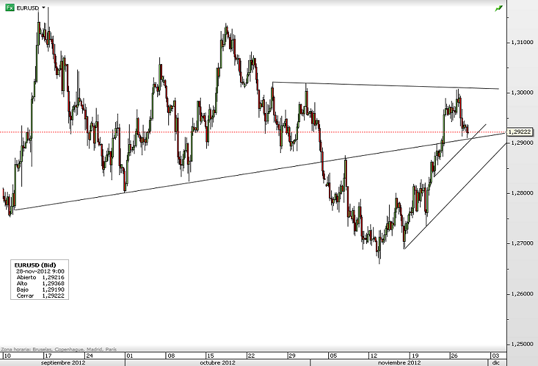 La cotización del Euro contra el Dólar se paró ayer en los 1.30 dólares generando una resistencia que en caso de ser superada en el corto plazo dibujaría una figura interesante ya que podría verse un hombro cabeza hombro invertido. Pero para ello debería respetar el soporte de los 1.29 dólares. Si nos fijamos en esa zona, viene desarrollándose desde que se produjo el fuerte impulso de este verano y que sirvió de apoyo durante los meses de septiembre y octubre que más tarde perdió a lo largo de este mes. La teoría de dice que lo que fue soporte es resistencia y lo que fue resistencia es soporte así que en este caso tendremos oportunidad de comprobar si la teoría se cumple en la práctica. Para ello mucho tienen que decir los líderes europeos y los datos macroeconómicos porque una salida por arriba del cruce significaría otro rebote en la renta variable al reducirse la aversión al riesgo.