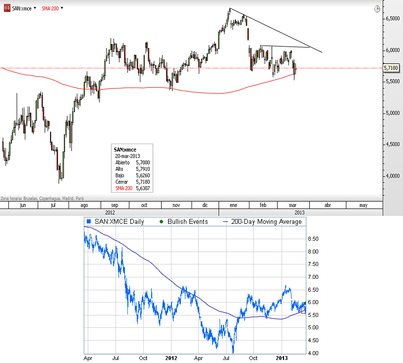 En cuanto al aspecto de la serie histórica del Banco Santander desde el pasado verano continúa siendo alcista a la espera de las siguientes zonas de resistencia en los 6 euros por acción. Mientras la media de las últimas 200 sesiones continúa aguantando podría ser una buena señal si permanece por encima de ella. Recordamos que el cierre del martes se situó por encima de ella y el mínimo de ayer fue también a apoyarse sobre ella. Si por el contrario la media no aguanta a precio de cierre, lo podríamos ver hasta el mínimo de noviembre.