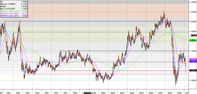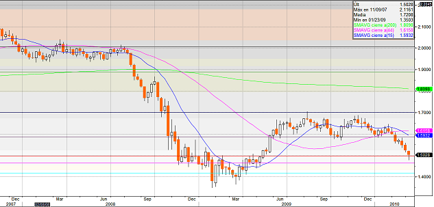 Desde el punto de vista técnico vemos como ha rechazado el soporte de 1,50$/Libra conformando una figura de “Hangman Doji” el cual nos puede estar dando señales de vuelta por la virulencia del rebote. La primera resistencia significativa a la que se va a enfrentar es la media diaria de 200 sesiones( que ahora se encuentra en un entorno de 1,5225), la cual frena todo tipo de idea de cambio de tendencia a Medio Plazo, hasta la ruptura de esta.