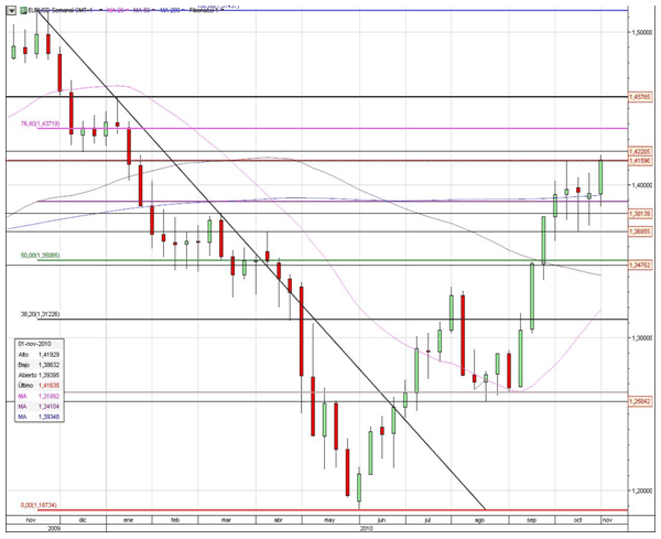 La jornada de ayer fue bastante tranquila mientras se hablaba de cuánto dinero la Reserva Federal iba a insertar en la economía. La FED ha mantenido los tipos de interés en los mínimos históricos, y a su vez ha dicho que va a inyectar 600 millones de dólares para reactivar la economía. Las compras se realizarán hasta finales del segundo trimestre del próximo año a un ritmo de 75.000 millones de dólares mensuales. El mercado realmente ha escuchado lo que quería oír y llevaba tratando de descontar en los últimos meses. Esto puede ayudar a que el mercado busque activos de riesgo en detrimento del dólar principalmente. Las bolsas americanas podrían buscar rápidamente nuevos máximos anuales si los datos macro acompañan. La inflación se sitúa en el 1,2% que está muy lejos del objetivo del 2,0% de la FED ayudando a tomar posiciones contrarias al dólar ya que el IPC se sitúa en mínimos desde 2001. El Dow Jones consiguió situarse en máximos desde septiembre de 2008, el petróleo se acerca a la barrera de los 85 dólares por barril y el EURUSD por encima de los 1.41 dólares por euro.
