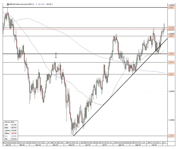 La esterlina ha marcado el máximo de los últimos nueve meses después de que el estado del sector servicios fuera superior a lo esperado. Los inversores están comenzando a olvidar que el Banco de Inglaterra vaya a inyectar más dinero a la economía británica. Es probable que este tema se olvide hasta el próximo año y por lo tanto hoy mantenga los tipos de interés y el programa de compra de activos sin cambios.