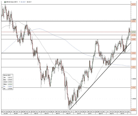 Realmente la guerra de divisas está en pié y Estados Unidos ha entrado muy fuerte en ella. La semana pasada volvió "helicopter"Ben a insertar más dinero en la economía americana que había sufrido una gran desaceleración económica. Está claro que el mercado lleva vendiendo dólares durante muchos meses, ya que recordar que el EURUSD marcó en junio el mínimo anual en los 1.19 dólares por euro, y actualmente se sitúa en los entornos de los 1.40. Por lo tanto, la Reserva Federal se une al Banco Central de China y Japón, que ya han estado impulsando medidas contra la apreciación de sus monedas. En resumen, una divisa más barata impulsa las exportaciones del país y ayuda a salir del estancamiento económico. Sin embargo, no son medidas muy bien recibidas por el resto de países y las consecuencias pueden ser que vuelva el proteccionismo entre naciones. La debilidad del dólar ha ayudado a la economía americana ya que desde Agosto está volviendo a mostrar resultados positivos. El viernes fue la culminación con un informe de empleo que dobló las expectativas demostrando que a Estados Unidos le ha venido fenomenal debilitar el billete verde.