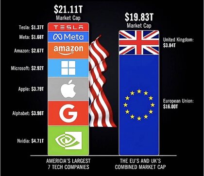 Siete empresas tecnológicas estadounidenses valen más que toda la economía bursátil de la Unión Europea y el Reino Unido juntos. Este dato no es una anécdota: es el síntoma de una crisis estructural que Europa lleva décadas ignorando.