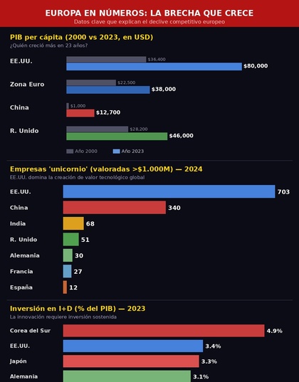 La respuesta corta es sí, pero no por el camino que lleva. El informe Draghi de 2024, encargado por la propia Comisión Europea, fue brutalmente honesto: Europa necesita una inversión adicional de entre 750.000 y 800.000 millones de euros anuales solo para no perder más terreno frente a Estados Unidos y China en tecnología, defensa y energía. Una cifra equivalente a tres veces el Plan Marshall en términos reales. Draghi llamó a esta situación una "amenaza existencial" para el modelo europeo. Pocos meses después, las instituciones europeas debatían cómo financiar un porcentaje ínfimo de esa cifra.