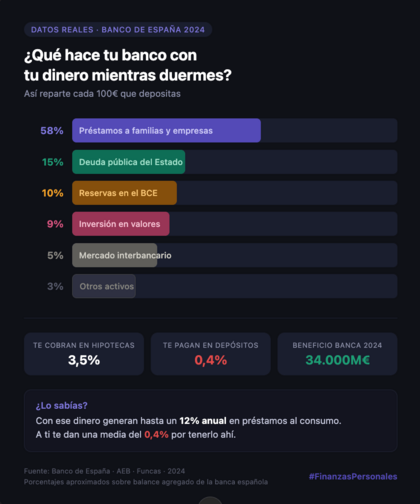 El resultado es previsible: hipotecas al 3,5%, préstamos personales al 8-12%, tarjetas de crédito al 20% o más. Tu dinero parado en cuenta corriente: un 0,4% de media en depósitos, si tienes suerte. El negocio redondo es para ellos.