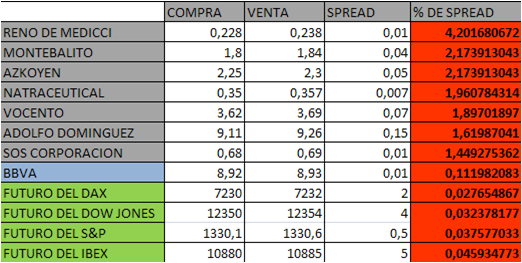 En este sentido es importante destacar que los futuros sobre índices pueden llegar a tener un spread de hasta 93 veces (como en el ejemplo que veremos a continuación) más pequeños en relación a muchos de los valores del mercado continuo, por lo que la operativa con futuros de índices es mucho más recomendable a la hora de reducir costes.
