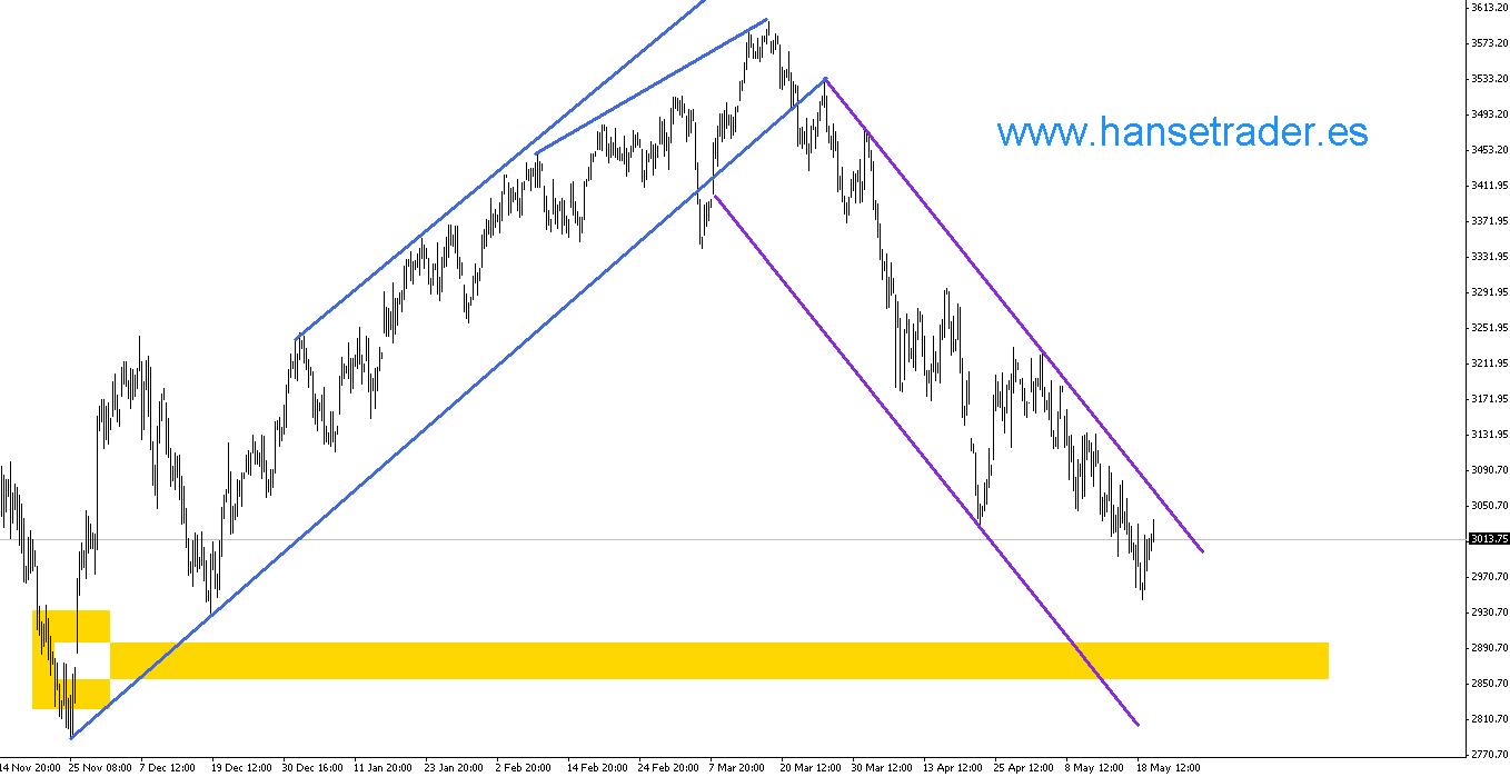 Por tanto una estrategia sería desde esta zona (3020 aprox.), la no superación de los 3045/50 para buscar entornos cercanos a los 2890 para tocar, o de 2860 para tapar el hueco comentado.
