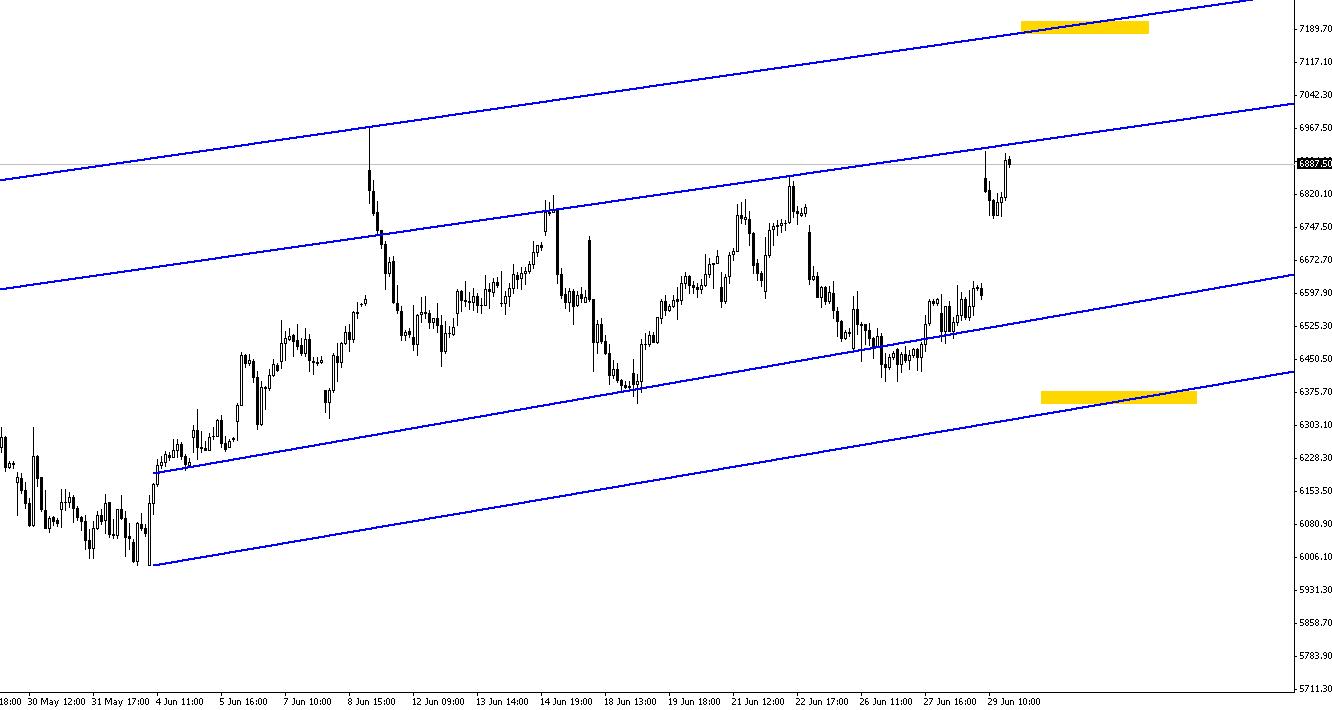 Desde el precio actual: Continuación de movimiento alcista hacia la zona 7190 con protección en 6790