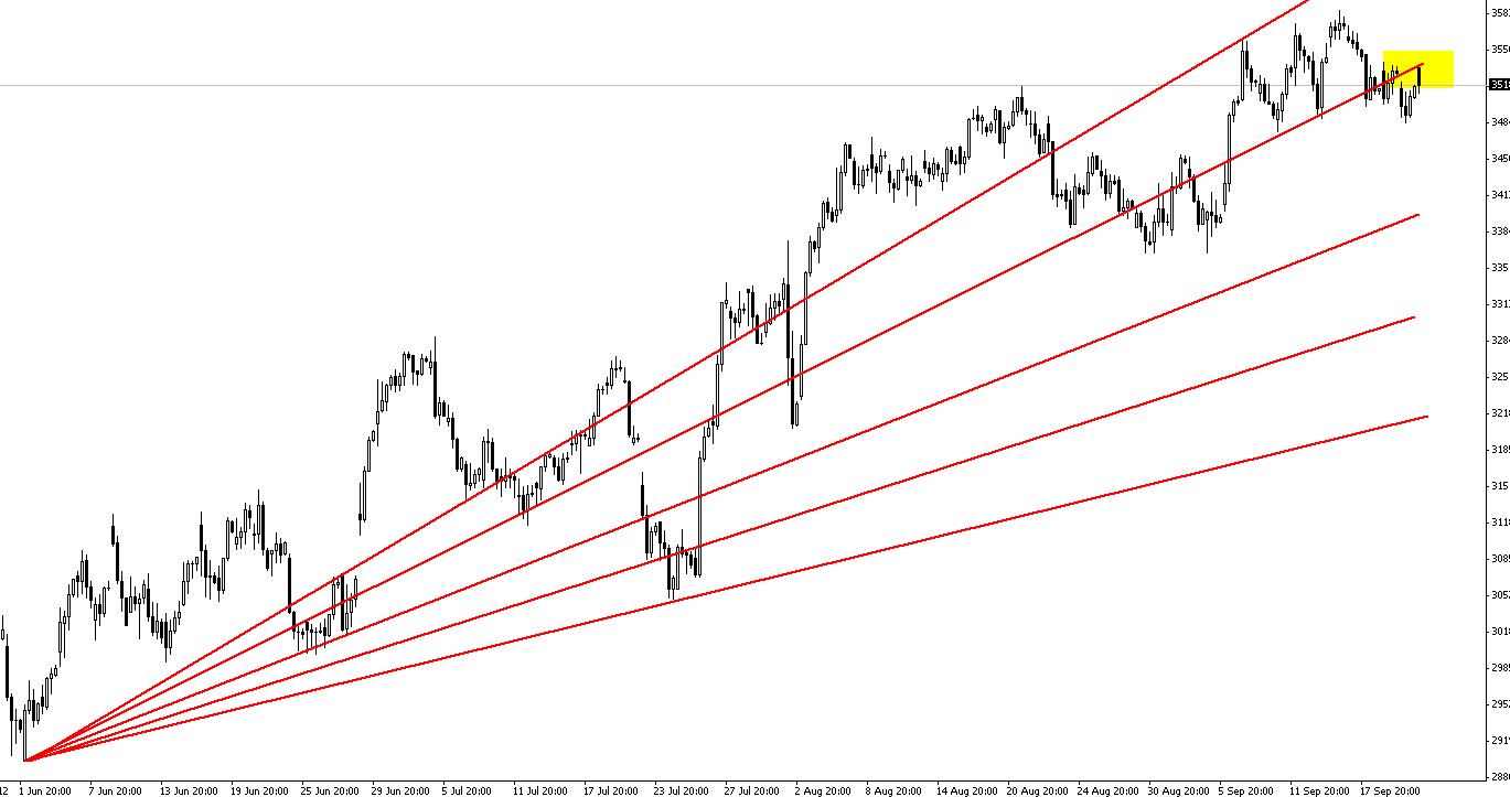 Movimiento en abanico de fibonacci para el futuro del índice francés. El CAC 40 (Par.fce) pregunta debilidad en su estructura. Podemos ver un H-C-H inclinado ligeramente al alza y en el día de hoy ha tocado su neck-line ya como resistencia. Toda no superación de la zona 3535 implicaría un movimiento bajista de continuación de dicha estructura, acompañado con resistencias en la estructura que comento, en abanico de fibonacci. Por tanto y siendo hoy vencimiento de futuros, además de máximos de 52 semanas del sector bancario francés, opino que la dirección operativa debería ser bajista.