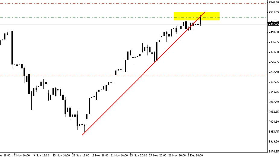 En el gráfico adjunto se puede ver una entrada en dichos niveles (en este caso de hoy, el posicionamiento ha sido en 7479) y no debería superar zonas comentadas de 7535/40.