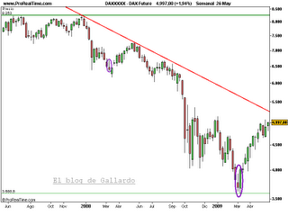 En el gráfico semanal del futuro del Dax 30 se aprecia una pauta de martillo invertido la semana del 2 de marzo de 2009. El martillo invertido se refuerza porque tiene lugar en una zona de importante soporte de largo plazo. La confirmación se produce la semana del 9 de marzo, con una Línea blanca grande. A partir de ahí se produce el movimiento al alza.