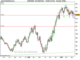 A pesar de lo anterior, y como curiosidad técnica, en el gráfico semanal del Bund, se puede distinguir lo que sería una formación de bandera, pudiéndose diferenciar nítidamente el mástil y el trapo; si bien no parece, dado el entorno macroeconómico actual y el nivel de los tipos de interés, que merezca mucha credibilidad.