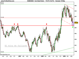 De cara a una posible operativa, no se puede dejar de considerar en ningún caso que se ha confirmado la ruptura de esa importantísima zona de soporte sita sobre 121,50, en lo que parece una formación de doble techo decreciente, y que todavía no se habría cumplido su objetivo bajista. La zona de 121,50 constituiría el primer objetivo en la retrocesión del movimiento, sin olvidar que el stop conlleva 100 puntos. Parece, pues, más aconsejable, cerrar posibles posiciones cortas en el futuro del Bund, que la apertura de posiciones largas.