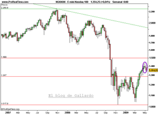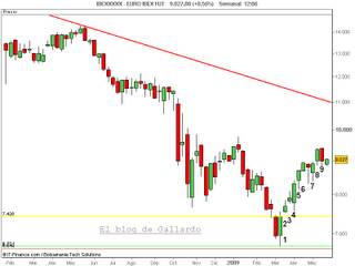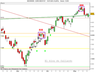En el gráfico semanal del futuro del Ibex tras ocho sesiones de registro aparece una vela de tipo envolvente que advierte de un techo de corto plazo y del inicio de una posible fase reactiva; si bien la envolvente no es muy poderosa y no cubre ampliamente el cuerpo real de la vela precedente.