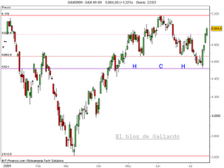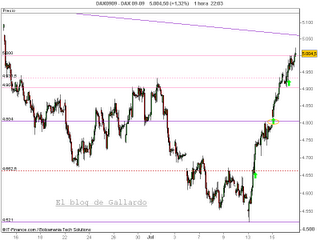 Los niveles a vigilar en el más rabioso corto plazo son los 5030-5050 y 4950-4930 del Dax. Mientras el hueco abierto en los 4800 siga vigente no debería haber mayores inquietudes bajistas.