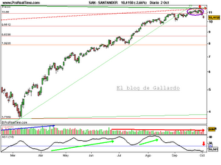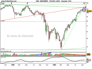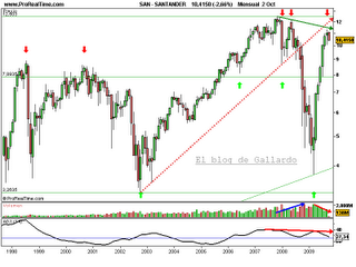 En el gráfico diario el lector debería terminar de convencerse de por qué Warren Buffet y Emilio Botín son grandes inversores. Si el lector frecuenta la prensa o la información económica, habrá leído que el Banco Santander pasó de una autocartera anecdótica a multiplicarla considerablemente entre enero y marzo de 2009. Y también habrá podido leer que ha ido reduciendo su autocartera hasta la mínima expresión desde julio a septiembre de este mismo año. Sin duda son fantásticos, compran como leones durante el último tramo de caída y venden tranquilamente durante el último tramo de subida.