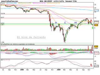 En el gráfico semanal se puede apreciar una figura de hombro-cabeza-hombro invertida que al igual que en los índices no ha alcanzado su objetivo. De igual modo, se puede observar cómo el ADX ha descendido y ha despreciado como tendencial todo el movimiento al alza acaecido desde marzo, movimiento que además ha cursado con un volumen que se podría considerar bajo y en todo caso inferior al de la caída de septiembre-octubre de 2008.