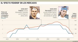 Desde el año 2003 hasta el año 2007 se desarrolla una impecable tendencia alcista en los mercados de renta variable. Durante esos años Roger Federer es el rey indiscutible del tenis mundial, hasta que, en el año 2007, Rafael Nadal comienza su ascensión, empieza a discutirle abiertamente el trono, y las bolsas parecen estancarse. En el año 2008 Nadal le arrebata la hegemonía, se convierte en el nuevo número 1, y las bolsas sufren una fuerte tendencia bajista.
