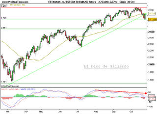 De cara a una continuación del escenario alcista, sería importante que el Euro Stoxx no perdiera el nivel de 2.660 puntos. De no ser así, su objetivo de caída estaría en la zona comprendida entre 2.550 y 2.500 puntos.