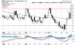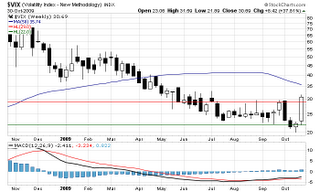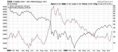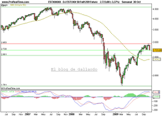 En el gráfico que he preparado en la página de Stockcharts para comparar la evolución del VIX con la del índice Euro Stoxx 50, se puede apreciar cómo la fuerte caída de septiembre y octubre de 2008 cursa con niveles muy altos del VIX y también cómo la subida que se produce a partir de marzo de 2009 discurre con niveles cada vez más bajos en el VIX. Es decir, la caída en el Euro Stoxx viene acompañadas de incrementos de la volatilidad y el miedo, y las recientes alzas se han dado con descensos en la volatilidad y con recuperación de la calma y la confianza. ![]()