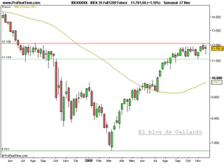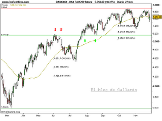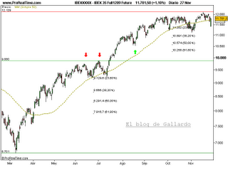 Si se compara con el futuro del Dax se puede observar no sólo una mayor verticalidad en la subida y unas correcciones menores, sino también cómo el Ibex en el tramo alcista de julio no realizó un retroceso a la zona de resistencias superada y cómo en el tramo de noviembre ha sido capaz de superar sus máximos previos.