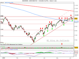 En el gráfico diario del futuro del Ibex se puede observar un movimiento alcista canalizado con máximos y mínimos crecientes; y, también, cómo las zonas de resistencia, una vez superadas, se han ido convirtiendo en zonas de soporte y han cumplido fielmente su función de apoyo. He marcado las zonas principales: 7.370, 8.100, 8.800 y 9.370, si bien también habría que tener en cuenta algunas zonas intermedias como 7.500, 8.300 y 9.170.